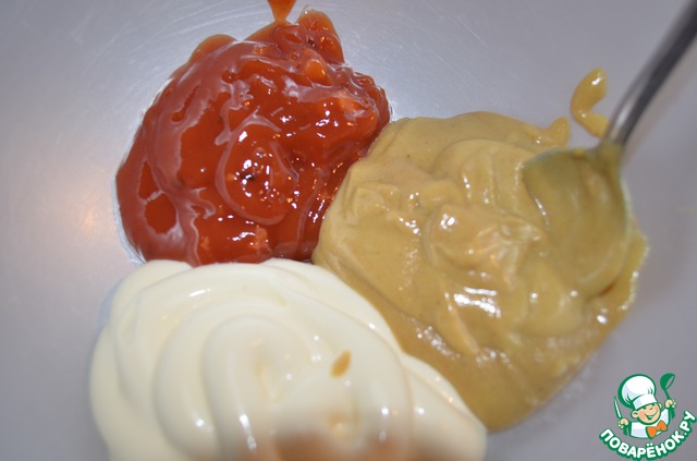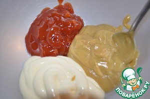 Смешиваем по 2ст. л. майонеза, кетчупа (томатного соуса-можно с кусочками овощей, как у меня) и горчицы. Самый "самолет"-с ядреной горчицей "Русской", но можно брать и менее ядреную. Но вот со сладкой горчицей-эффект будет немного не тот, при ней тогда, наверное, убрать кетчуп -