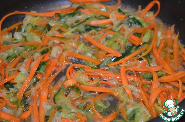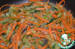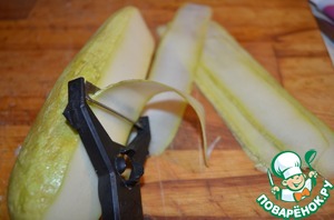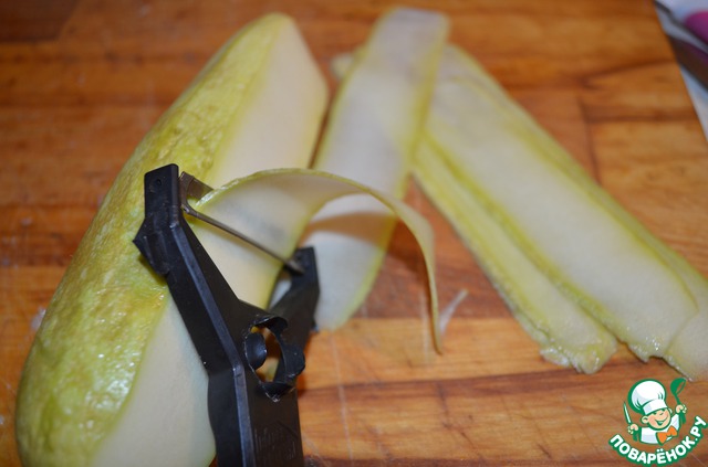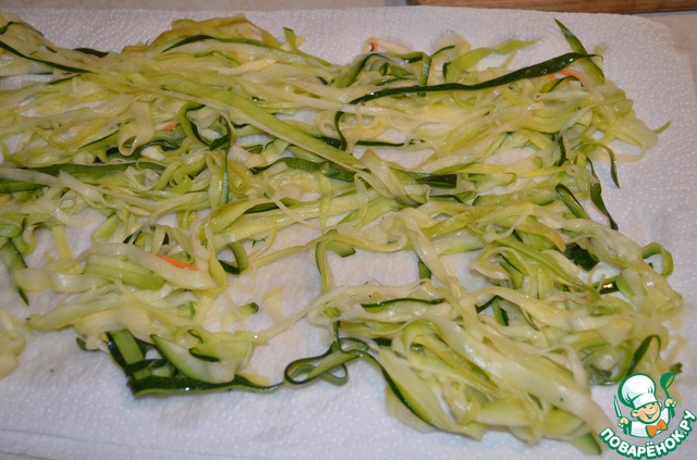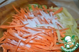 Овощи сначала нарезать тонкими продольными ленточками по всей длине, а затем-каждую ленточку нарезать тонкой длинной соломкой