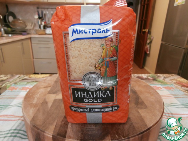 Для приготовления этого блюда я использовал "Индика-голд", янтарные зёрна пропаренного длиннозёрного риса.