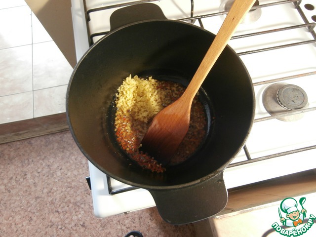 Слегка усиливаю огонь и всыпаю в кастрюлю семена зиры, 1-2 ч. л. мелко нарезанного красного острого перца, а вы кладите столько, сколько вам по вкусу,