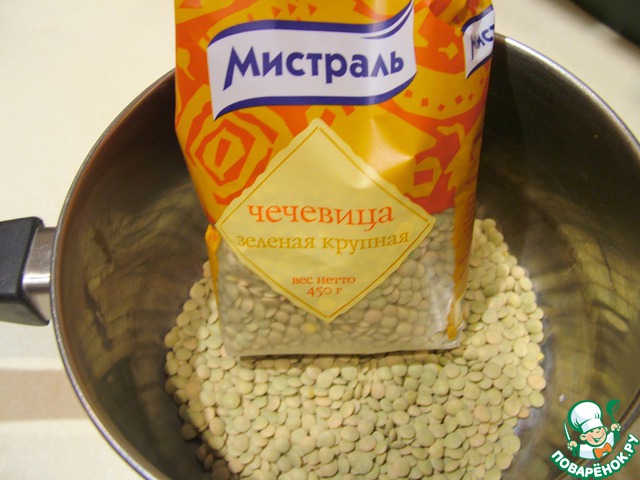 100 г чечевицы промыть, добавить 200 г воды и варить на слабом огне под крышкой полчаса. Вода практически вся впитается в чечевицу.