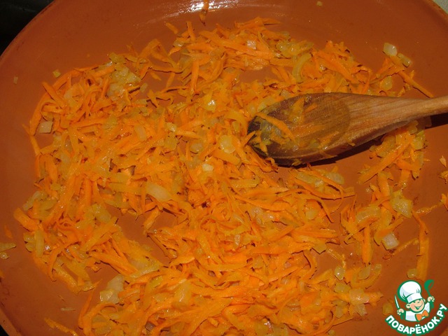 Пока варятся рис и чечевица, поджариваем на растительном масле мелко нарезанную луковицу и натертую морковь до золотистого цвета.