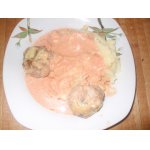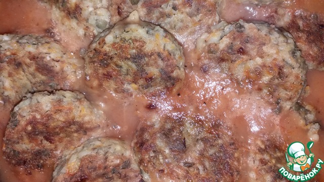 Подливка: стакан воды, три ложки томатного соуса, столовую ложку муки, по пол-чайной ложки сахара и соли хорошо размешиваем и выливаем прямо на жарящиеся тефтели. Подливка закипит и загустеет. Выключите огонь и оставьте под крышкой на 5 минут. Если не любите подливку, можно обойтись и без неё!