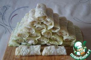 Капусту обработать так, как вы привыкли. Кто-то вырезает кочерыжку и припускает капусту в кипятке несколько минут, кто-то отделяет листья по одному и обваривает их по отдельности от кочана. У молодой, нежной капустки кочерыжку вырезать было очень легко, что я и сделала. После этого поварила капусту в кипящей подсоленной воде минуты 4, достала, сняла примерно половину листьев, пока они легко снимались, а кочан вернула в кипяток еще на 3 минуты. После этого и оставшиеся листья хорошо снимались. Отвар сохранить.