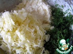 А пока приготовить начинку. Творог смешать с тертым сыром и зеленью.