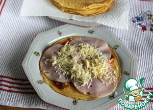 Выложить тонконарезанную вареную ветчину (или салями), покрывая всю поверхность блинчика, посыпать тёртым сыром