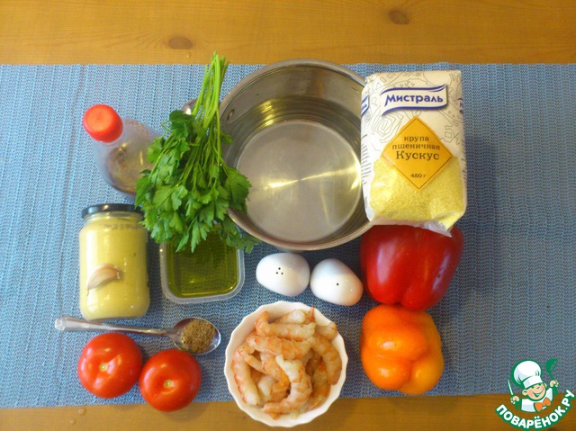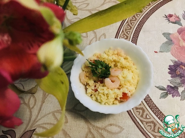 Кто-то скажет, что "ничего интересного, это же табуле"... Но добавив в салат креветки, приготовив для них специальный соус, наш салатик заиграл новыми нотками вкуса и красок - стал более питательным, ароматным, вкусным! Не нужно долго стоять у плиты, достаточно кипятка, немножко терпения и фантазии. Яркие краски вКускусного салата добавят заряд бодрости и энергии!