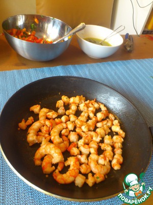 • Сырые креветки отварить, варено-мороженые немного обжарить. Крупные креветки нарезать.