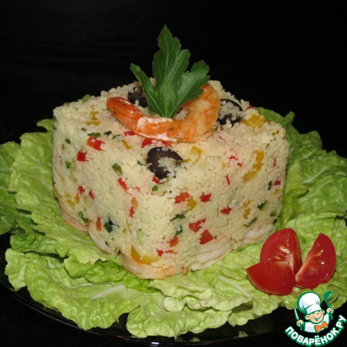 Затем слой кускуса с овощами, украсить креветкой и листиком петрушки. Подавать с горчичным соусом.