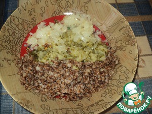 Лук режем мелкими кубиками и обжариваем на растительном масле. Солёные огурцы трём на тёрке, слегка отжимаем сок. Гречку смешиваем с жареным луком и огурцами.