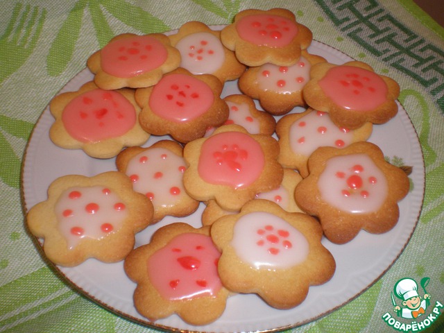 Одну часть печенья покрываем белой глазурью и окрашенными точками-тычинками, вторую - окрашенной глазурью и белыми точками-тычинками. Печенье готово! Приятного Вам аппетита!