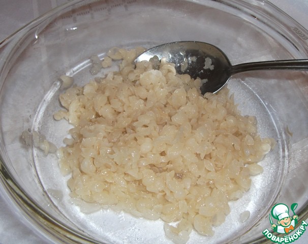 • Насыпаем в миску 3 ст. л. рисовых хлопьев, добавляем 1 ст. л. коричневого сахара и заливаем 70 мл. горячей воды.