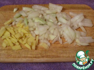 Обжарить лук с имбирем в течении 5 минут. Добавить измельченную зелень кинзы.