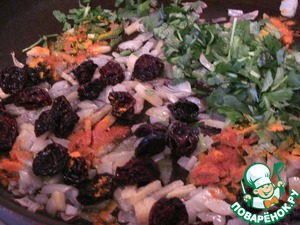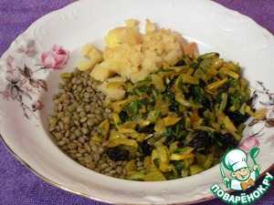Чечевицу смешать с пережаренным луком, изюмом, куркумой, кинзой и кусочками измельченной мякоти айвы.