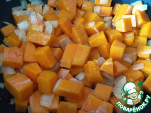 Добавить тыкву и обжарить на сильном огне в течение 5 минут.
