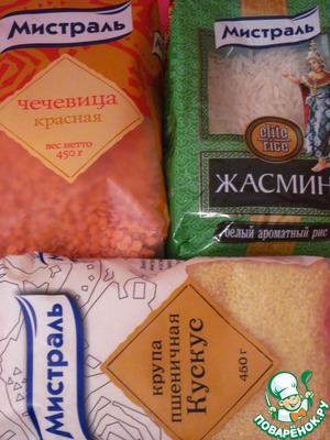 Для хлебушка потребуются следующие крупы компании "Мистраль" - чечевица красная, рис марки Жасмин, крупа пшеничная Кус-кус.
