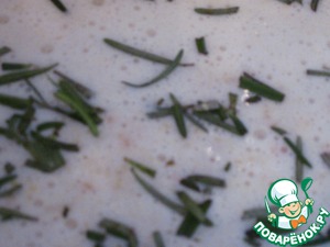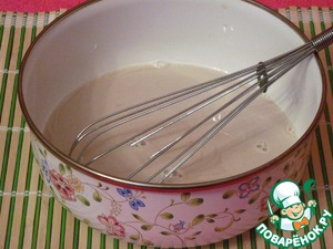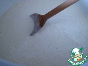 Тонкой струйкой влить теплую воду, сок яблочный и 2 ст. л. масла оливкового. Хорошо размешать.