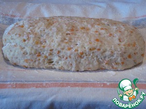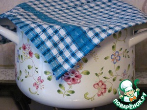 Полотенце присыпать мукой и выложить на него часть теста, придать нужную форму, накрыть сверху и оставить на 2 часа в теплом месте.