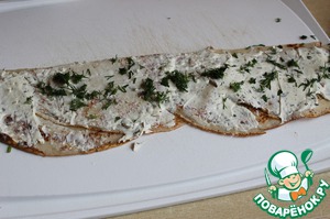 Теперь берем любой сыр, у меня Филадельфия, она была уже с травкой но я еще порезала укроп..