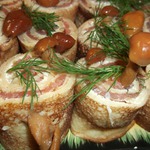 И аккуратно сворачиваем.. ставим, прижимаем слегка.. так поступаем пока не кончится рыбка.. у меня только получилось 3 пенечка. Затем украшаем грибами. делаем ножом надрезы не глубокие и вставляем туда грибы.. НУ дальше ваша фантазия... я брала листья салата и ставила на них пенечки. Приятного!