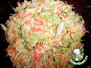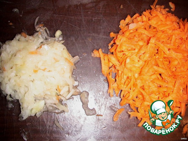 Морковь и лук натереть на крупной тёрке. Лук - это лёгкая острота, а морковочка - сладость. Эта смесь вкусов придаст салату особенную пикантность.