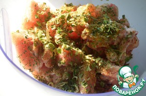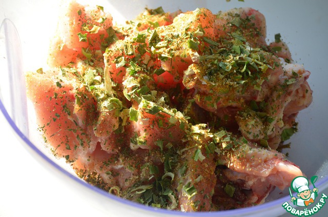 • Куриные ножки порубить на не большие кусочки, посолить, посыпать перцем, специями, сушеной зеленью