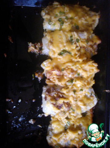 Затем окунаем в кляр и на сковороду, обжариваем с двух сторон по 2 минуты и вылажеваим в приготовленную емкость для запекания-посыпаем сыром и ставим в разогретую духовку на 15-20 мин.