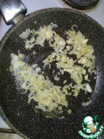 Нарезаем лук полукольцами, высыпаем на разогретую сковороду с подсолнечным или оливковым маслом (сковороду сразу берите большую) и поджаривем, пока не станет позрачным. И добавляем 0,5-1 ч. л. сахара (я часто кладу в блюда сахар, так они становятся более мягкие, сладковатые на вкус - это на любителя, пробуйте).