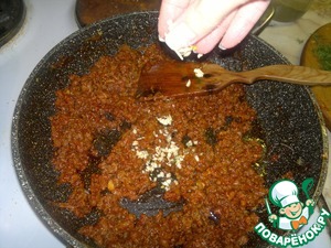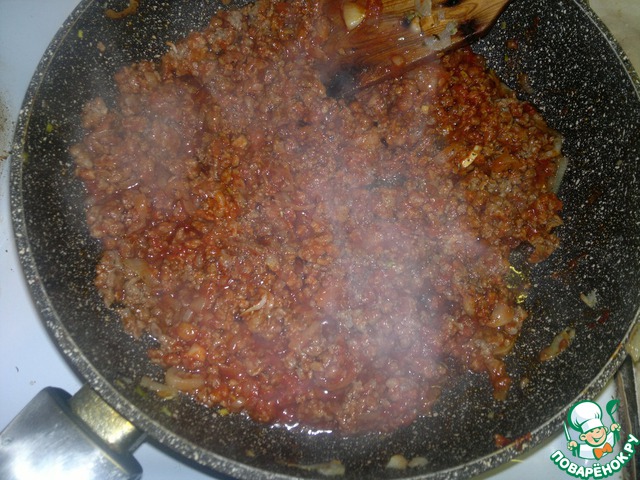 Итак, через 10-15 минут к фаршу добавляем томатную пасту, все смешиваем и готовим еще минут 10 до готовности на медленном огне при закрытой крышке.