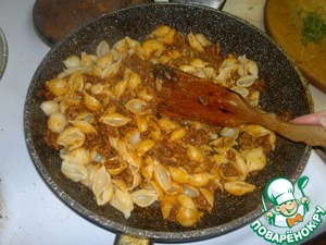 Готовые ракушки высыпаем к фаршу и всё аккуратно перемешиваем