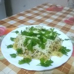Перекладываем всё в тарелочку и посыпаем сверху тертым сыром. Можно добавить еще зелень.