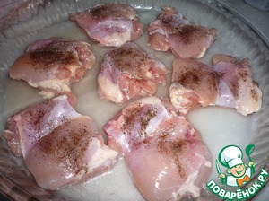 Выложить курицу в керамическую жаропрочную форму, предварительно посолив и поперчив.