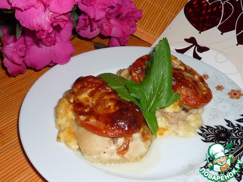Выложить ломтики баклажана поверх курицы, сверху выложить помидор. Сверху-майонез с чесноком. Накрыть ломтиками сыра. Запекать в течение 30 мин., в предварительно разогретой духовки (180 град.).