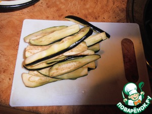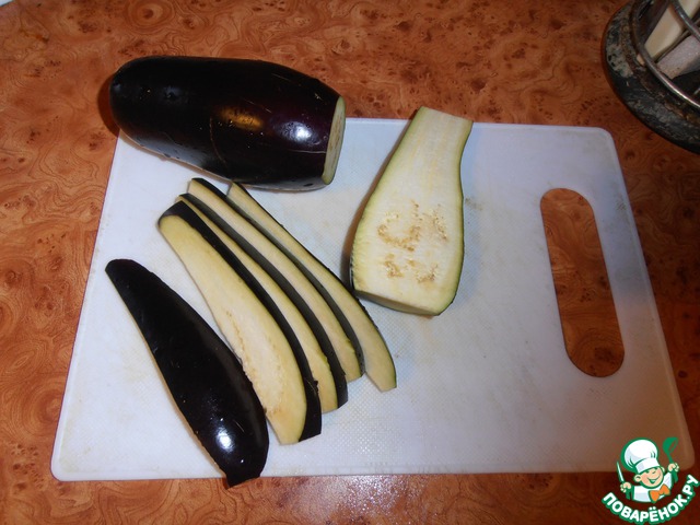 • Баклажаны вымыть, отрезать кончики и порезать вдоль: сначала пополам, затем каждую половину ещё пополам, и затем на толстые полоски (шириной не менее 1 см).