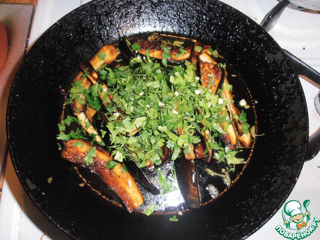 • Когда все баклажаны готовы, сложить их в сковороду, засыпать зеленью, перемешать и полить водой.