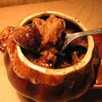 Обжарив последнюю партию мяса, переложите его в толсто-донную кастрюлю, а сковороду дегласируйте вином. Пусть вино немного покипит, затем вылейте его в мясо.