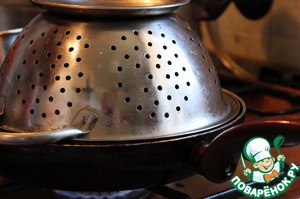 Для того, чтобы масло не забрызгало все вокруг накройте сковороду дуршлагом.