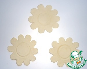Выдавить (не вырезать) кружки с помощью рюмки по середине каждого цветочка из теста.