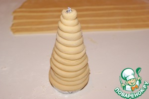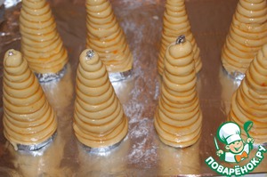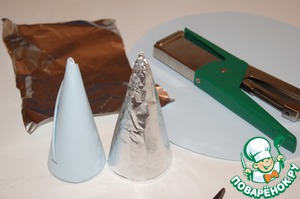 Из не очень плотного картона, я использовала папки, вырезать круг диаметром 22 см. разрезать его пополам и скрутить из половинки конус, закрепить его степлером или скрепкой. Обернуть фольгой. Получается устойчивый и очень удобный конус для выпечки в вертикальном положении, который можно использовать много раз. -