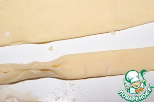Раскатать тесто в пласт толщиной 0,4 см и нарезать на полоски шириной 1 см. слепить края полоски и скатать в жгут.