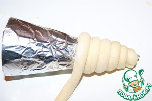 Намотать жгут на конус отступив от края и не доходя совсем до конца, так будет удобнее снимать рожок с формы.