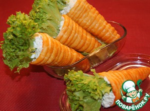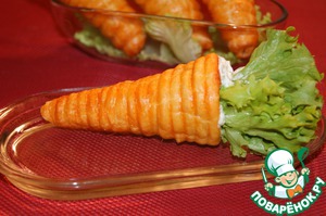 Очень популярный не только в Греции салат дзадзики (цацики) , но слегка переданный мной в крем + хрустящий рожок из домашнего теста и листья зелёного салата - всё это оформлено в закусочное пирожное, имеющее форму морковка. Рецепт теста и идею с формами подсмотрела на польском кулинарном сайте. На поварёнке уже есть такие рецепты, но... проблема с формами, да и сам рецепт теста и салата привели меня к выводу - рецепт имеет место быть!
