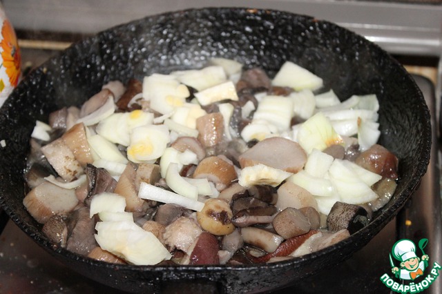 В это время обжарить грибы и нарезанный лук на растительном масле.