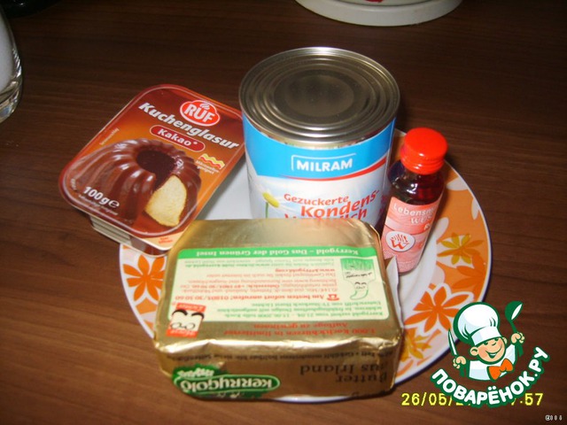 Пока корж выпекаеться, нужно сделать крем. Сгущенное молоко соединить с маслом и взбить.