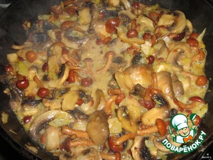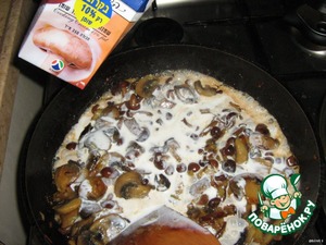 Когда грибы обжарятся - вылить в них пакетик сливок и протушить все вместе минут 5.
