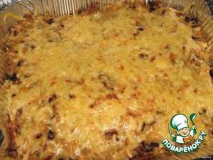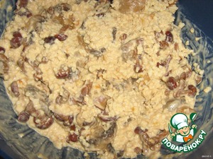 Смешать грибы с готовой кашей. Выложить в форму, посыпать тертым сыром и в духовку минут на 10-15.