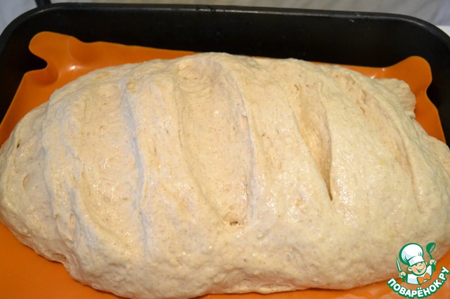 Формируем батон, выкладываем его на смазанный противень, делаем надрезы и убираем на расстойку в теплое место на 30-35 мин.