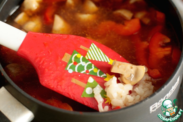 • Вернуть грибы с маслом к бульону, добавить готовый рис, нарезанный дольками перец и влить соевый соус.