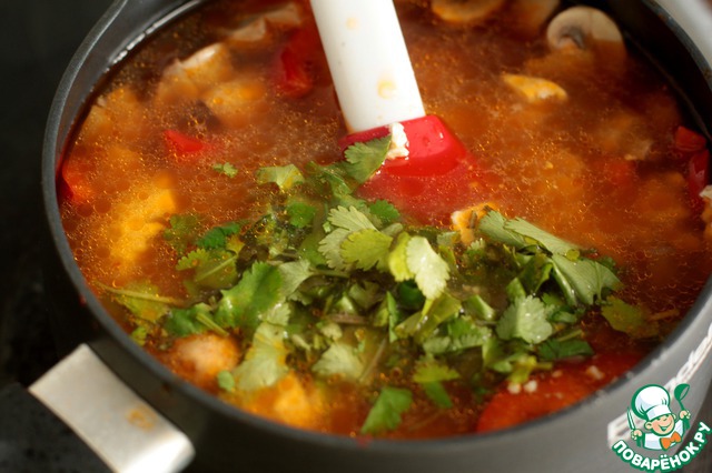 • Последний штрих - добавить тофу и кинзу. Довести до кипения и разлить по тарелкам.