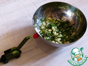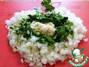 Лук очистить, мелко нарубить. Чеснок очистить, пропустить через чесночный пресс. Зелень очень мелко нарубить.